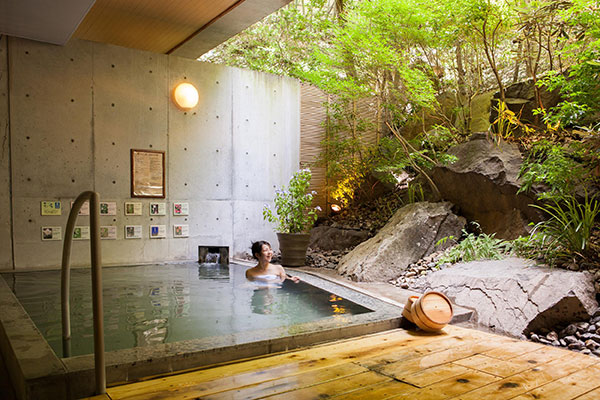 緑の中では心身が爽やかに癒され、温泉では心身がのびやかに開放されます。 二つの自然の効能が堪能できる「花いずみの湯」。森林浴気分でゆったりお楽しみください。 お肌がつるつるになると地元の方にも好評。とろっとした泉質が温泉気分を一層引き立てます。 お風呂上がりは涼み処でリラックスしてください。